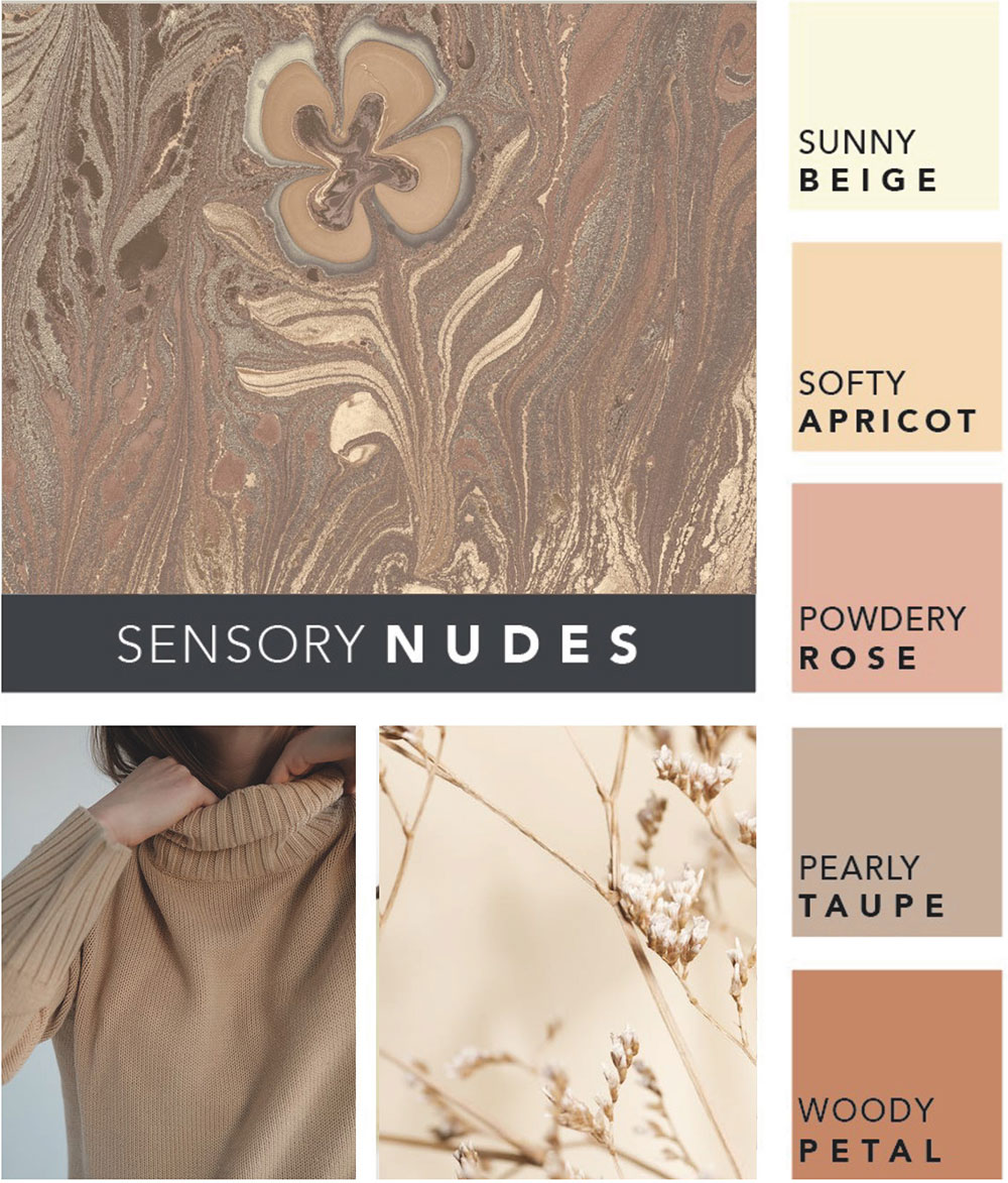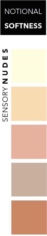 SENSORY NUDES als Farbpalette, integriert Farben, die subtil und elegant sind. Sie verleihen jedem Raum oder Outfit eine zeitlose Schönheit und schaffen eine ruhige und harmonische Atmosphäre. Ihre dezente Präsenz wirkt beruhigend und lädt zum Entspannen ein. Nudetöne passen zu verschiedenen Hauttönen und Haarfarben und strahlen eine natürliche Schönheit aus. Sie lassen uns wohl fühlen, sind anschmiegsam, wirken fließend und können transluzent sein. Sie können unsere mentale Gesundheit stabilisieren und lassen uns die Person sein, die wir sind. Alles wirkt weich, sehr körperbezögen und der Fokus liegt auf unserem Gefühl undunserem Empfinden allgemein.