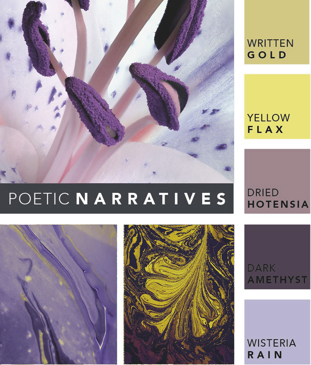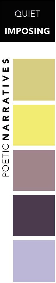 Die Farbpalette POETIC NARRATIVES bringt zwei Farbwelten zusammen, die in der Kunstwelt oft zusammentreffen und so malerisch sowie poetisch wirken. Fliedertöne wirken sanft und beruhigend und lassen uns unseren Blick ins Innere richten. Sie erzeugen eine Atmosphäre von Ruhe und Gelassenheit. Flieder wirkt stresslösend und harmonisierend. Dunkle Lilatöne finden wir viel in getrockneten Blumen, sie erinnern uns an die Vergänglichkeit, an unsere Traditionen und Geschichten. Die Gelb- und Goldtöne strahlen vereint Wärme und Glanz aus.