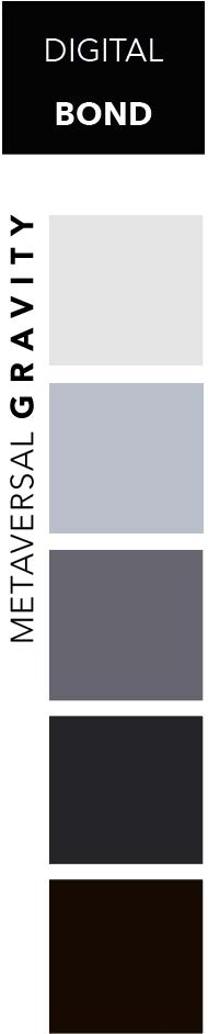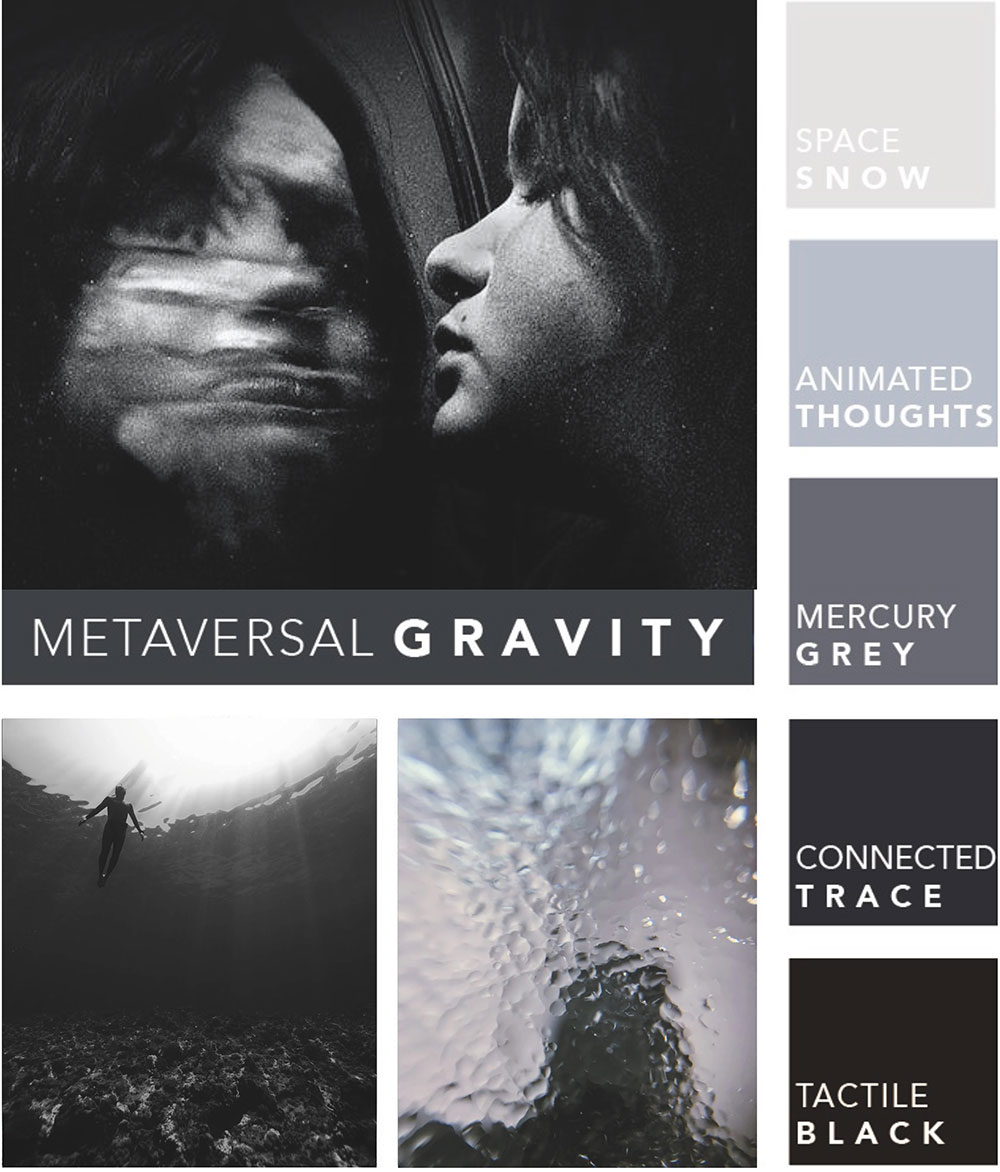 Schwere Grau- und Schwarztöne formen die Farbpalette METAVERSAL GRAVITY. Sie erinnern an die Schwerkraft des Lebens, das Universum, das heutige Metaversum und die Verbindung von Realität und digitalen Sphären. Sie sind dicht und hochpigmentiert. Grautöne in verschiedenen Nuancen stabilisieren, neutralisieren und symbolisieren Minimalismus. Sie wirken kühl und ausgleichend. Schwarztöne in ihrer tiefsten Form verkörpern Mysterien, Eleganz und Autorität. Sie verleihen jedem Interieur Dramatik und Tiefe. Sie erschaffen Unbekanntes, das nicht durchdringbar ist. Sie erinnern an die unendlichen Weiten des digitalen Universums. Unsere Zukunft ist vorbelastet, wirkt schwer und unsicher. Trotzdem zeigen wir uns stark, standfest und konzentriert.