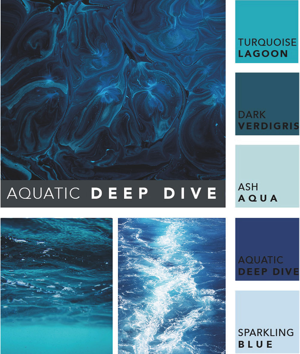 Die Kombination von tiefen, hellen, dunklen und türkisfarbenen Blautönen lassen uns tief fühlen und faszinieren. Die Farbpalette AQUATIC DEEP DIVE reißt uns in die Unterwasserwelt und die Tiefen des Lebens. Trotz der Unsicherheit in der Tiefe, schenken uns diese Farben Ruhe und Gelassenheit. Sie lassen uns Stark fühlen und symbolisieren Weisheit. Helle Blautöne strahlen Frische und Leichtigkeit. Sie lassen uns Unbeschwert fühlen und wirken sanft. Dunkle Blautöne können auch ein Gefühl von Abenteuerlust hervorrufen und uns dazu inspirieren, das Unbekannte zu erkunden. Türkisfarbene Blautöne stehen für Erneuerung und die Verbindung zur Natur. Sie wirken heilend und gleichen aus.