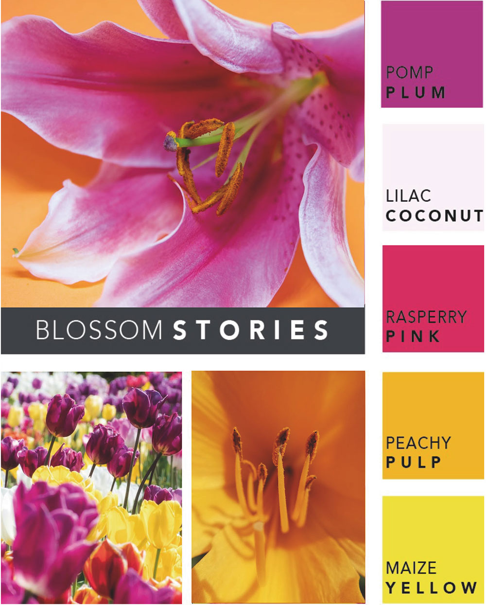 BLOSSOM STORIES zeigt uns das blühende Leben. Die Kombination aus wunderschönen blumigen, lebendigen Pink-, Gelb-, Orange und Lilatönen in einer Farbpalette erzeugt eine energetische und liebevolle Atmosphäre. Sie alle ziehen Aufmerksamkeit auf sich. Pinktöne symbolisieren Liebe und Zärtlichkeit. Sie wirken romantisch und verspielt. Positive Stimmung und ein Gefühl von Freude und Leichtigkeit lassen und wohl fühlen. Gelbtöne in ihrer lebendigsten Form strahlen Energie, Optimismus und Lebensfreude aus. Sie schenken uns Licht, Wärme und heben unsere Stimmung. Orange begeistert und und lässt uns vital fühlen. Orangenuancen sind dynamisch und stimulierend. Magentatöne leuchten und symbolisieren Leidenschaft.